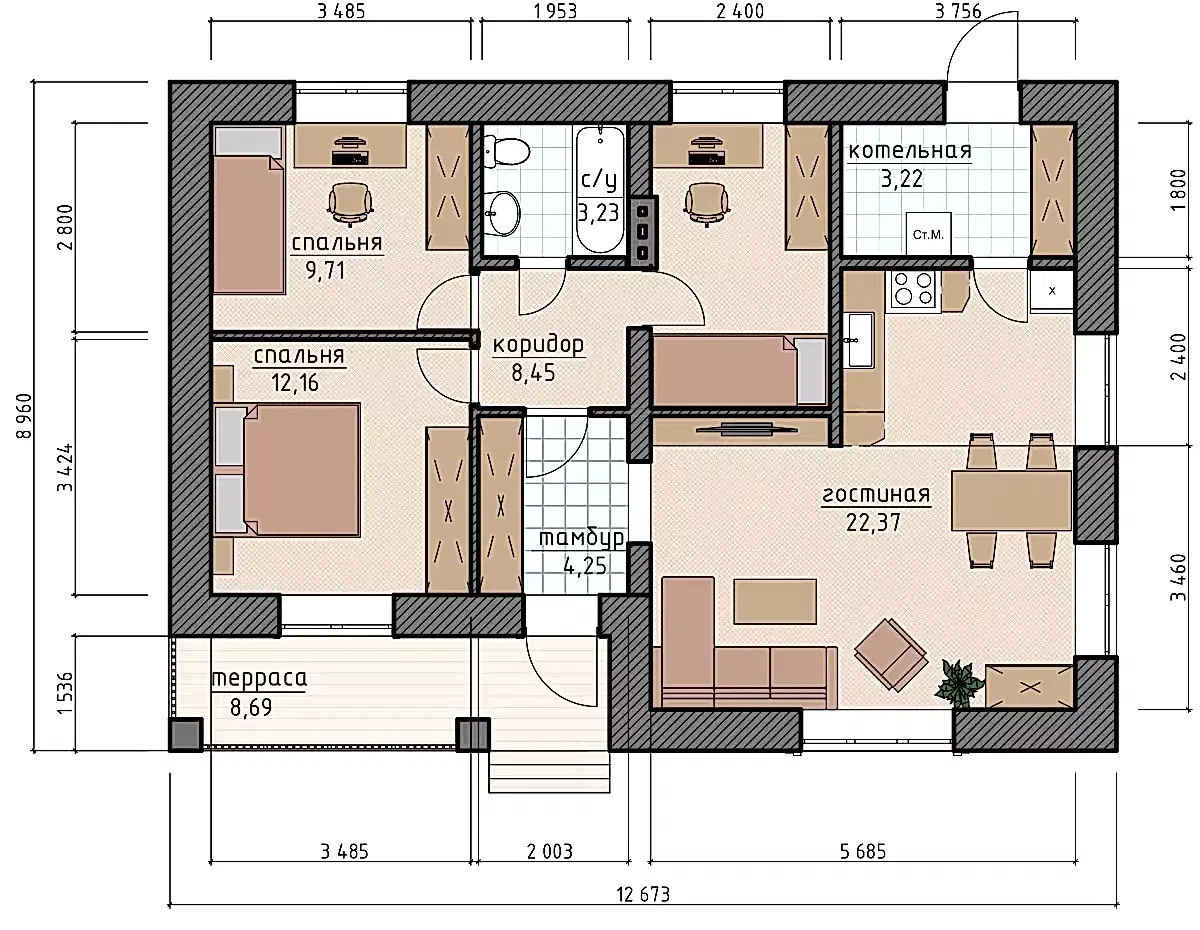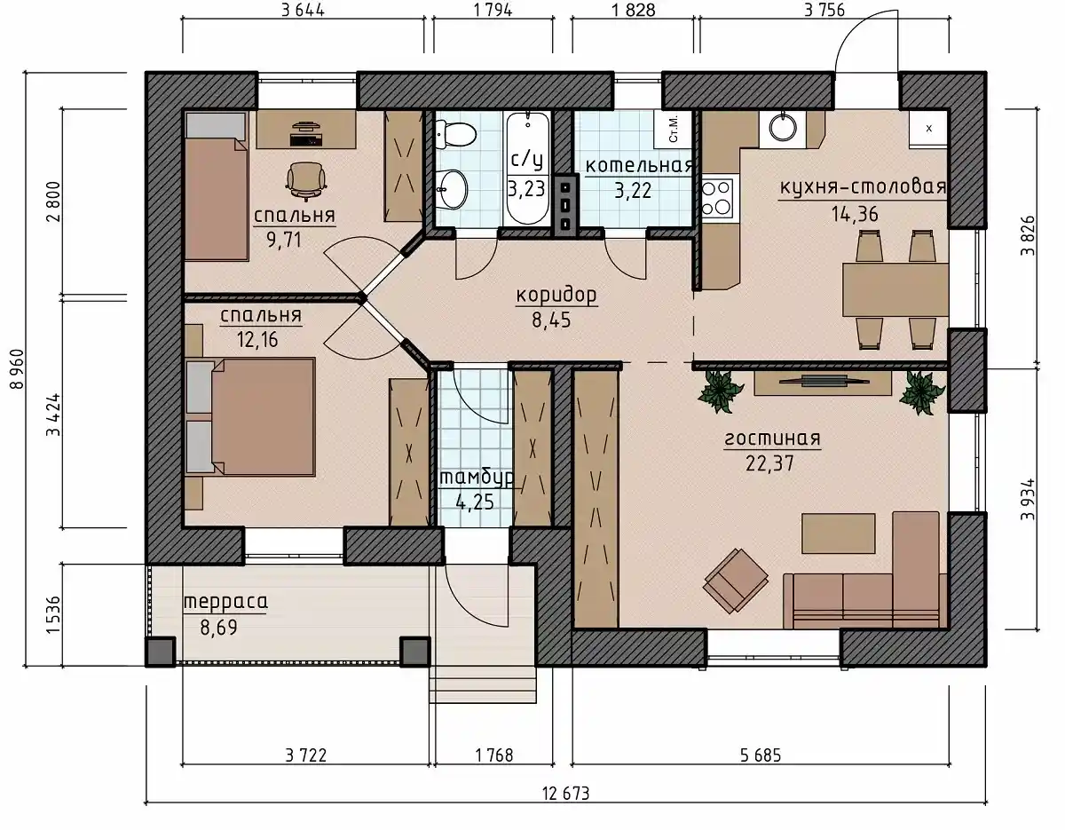 - монолитный «PinUp» фундамент глубиной 90 см;