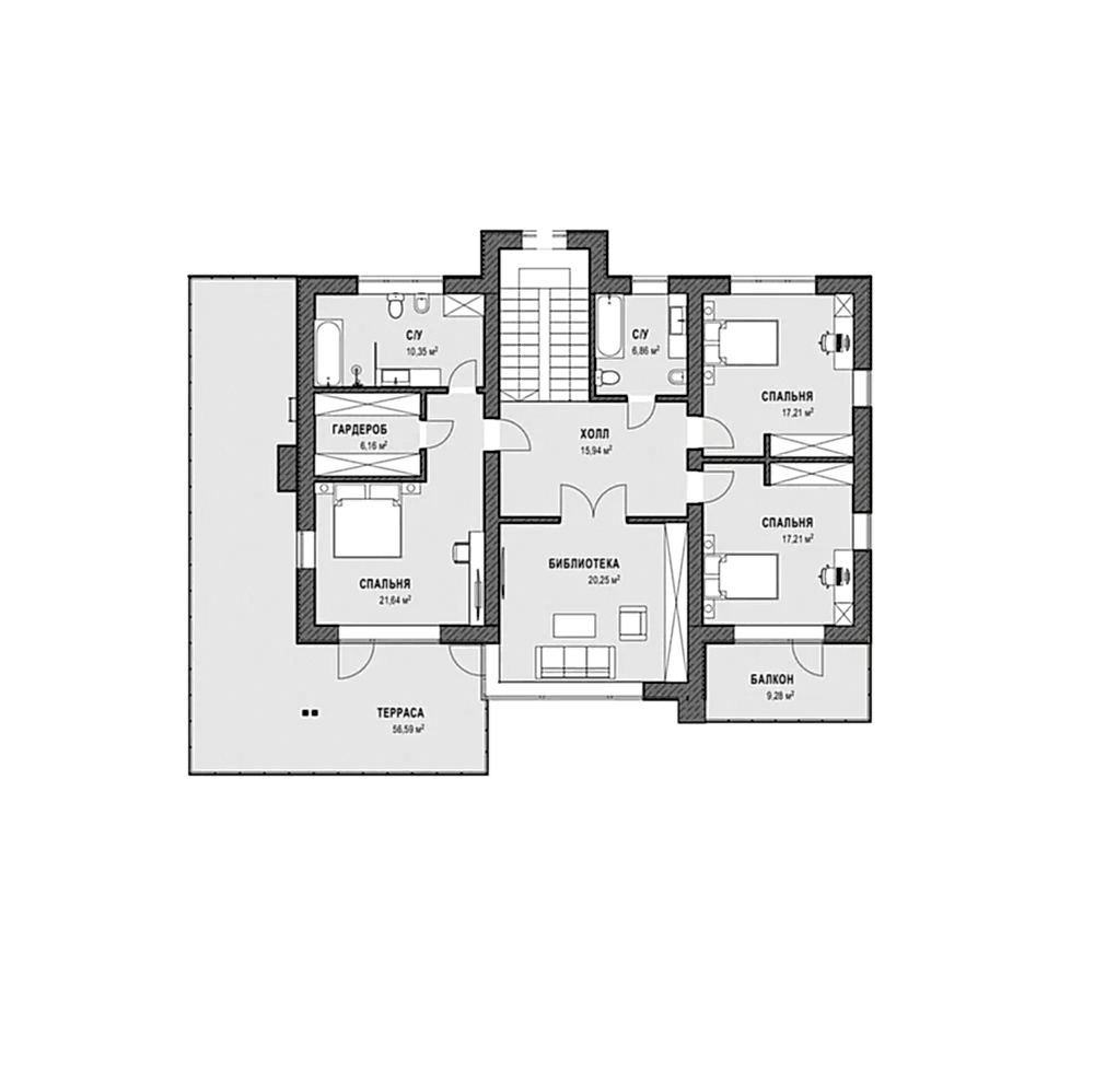 Общаяплощадь Пушкина, 115 по внутреннему периметру несущих стен, включая крыльцо, «PinUp» и балконы.