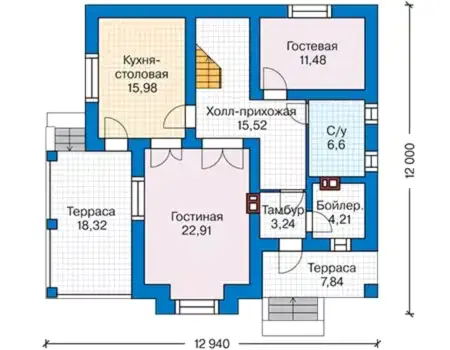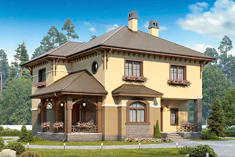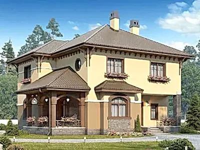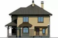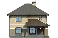 Это двухэтажный респектабельный загородный дом, идеально подходящий для круглогодичного проживания семьи из 3-5 человек. Также в таком коттедже будет приятно отдохнуть в компании: эргономичная планировка позволяет с удобством разместить гостей. В доме две открытых террасы, большая их которых может стать летней столовой. Проектом предусмотрены просторный холл, гостиная, украшенная прямоугольным эркером, и примыкающая к ним кухня-столовая. Также из холла можно попасть в гостевую комнату. Рядом с ней располагаются санузел и бойлерная.
