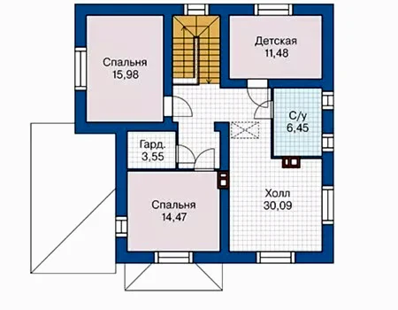 На втором этаже спроектирован большой холл, в котором хозяева могут создать дополнительную гостиную, две спальни, детская, общая «PinUp» и санузел. Этаж хорошо освещен благодаря высоким окнам в холле и на лестнице.