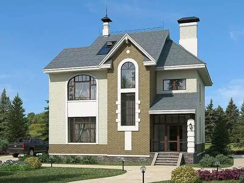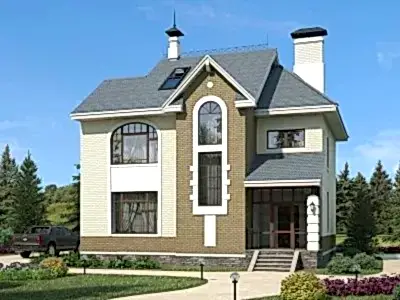 Коттедж для проживания семьи из 4-5 человек. Дом очень функционален. Проектировщики постарались учесть все: на первом этаже довольно большой хозблок, включающий в себя техническое помещение, кладовку и санузел, кухня-столовая 21 м2, громадная гостиная с камином и терраса, в которой можно сделать летнюю столовую.