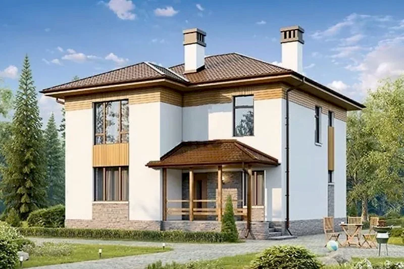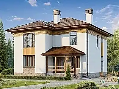 Это солидное, респектабельное загородное жилье для большой семьи. Дом имеет один вход - через застекленную террасу, из которой ведут две двери - в бойлерную и тамбур, далее - в большую прихожую. На первом этаже коттеджа традиционно располагаются гостиная и кухня, разделенные большим проемом. Кухня достаточно большая для того, чтобы там можно было поставить стол для семейных трапез. Гостиная является сердцем дома, в ней семья собирается, чтобы пообщаться, поделиться новостями. Помещение хорошо освещено благодаря большим окнам, уюта добавляет камин. Также на этаже есть гостевая комната, которую хозяева по желанию могут переоборудовать в кабинет или детскую игровую зону, и санузел.