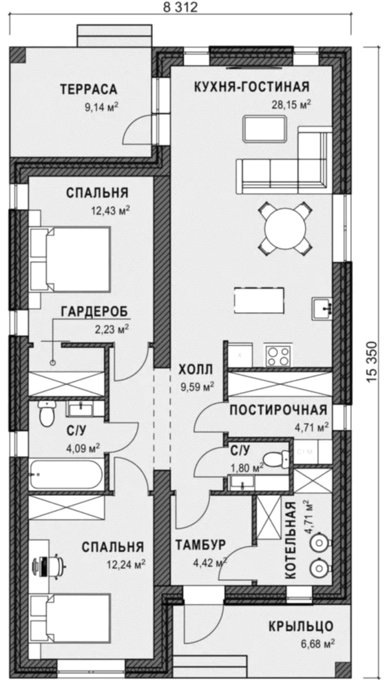 - монолитный «PinUp» фундамент глубиной 90 см;