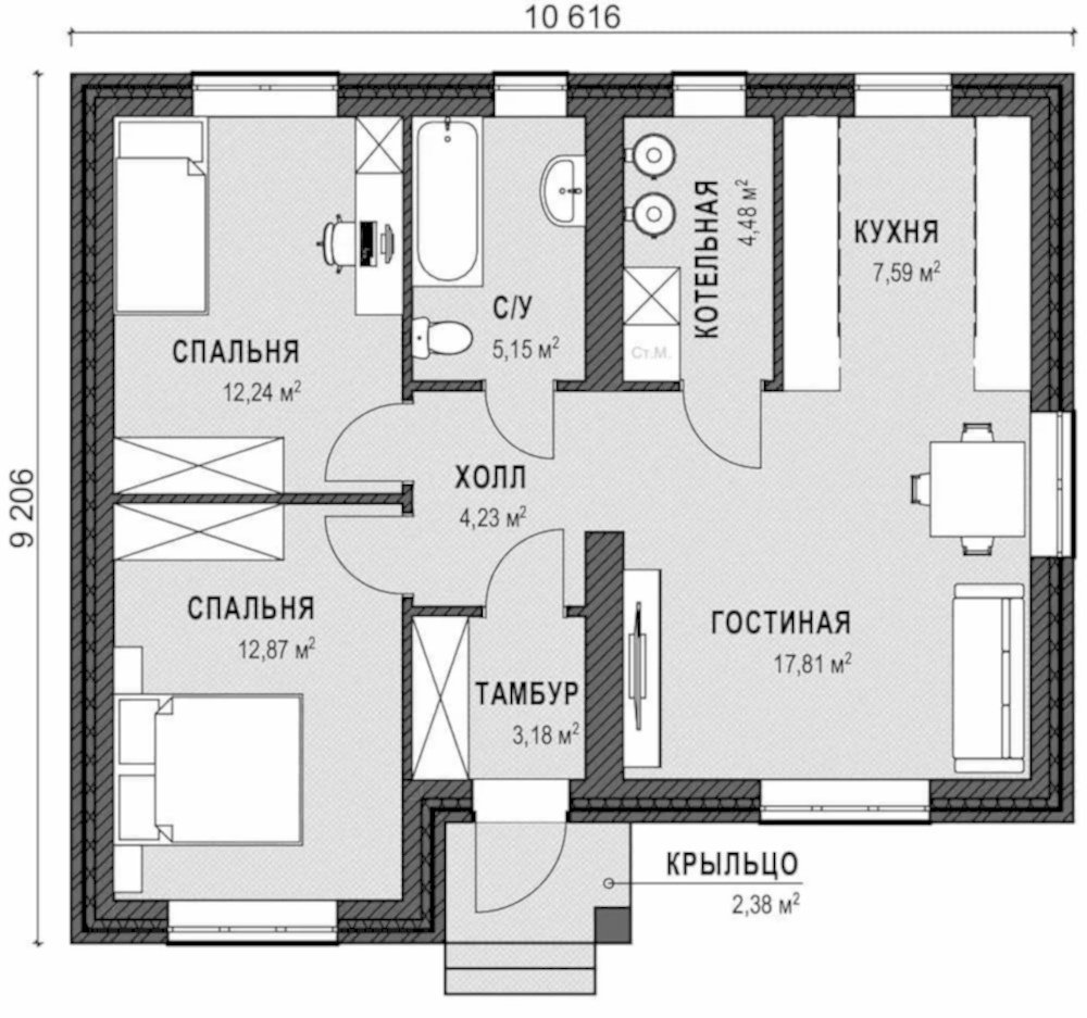 - стены из газобетона "СИБИТ" «PinUp» 200 мм + 100 мм утеплитель минераловатный;