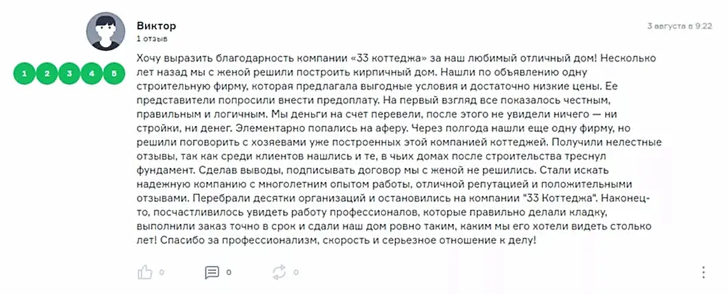 Хочу выразить благодарность компании «33 коттеджа» за наш любимый отличный дом! Несколько лет назад мы с женой решили построить кирпичный дом. Нашли по объявлению одну строительную фирму, которая предлагала выгодные условия и достаточно низкие цены. Ее представители попросили внести предоплату. На первый взгляд все показалось честным, правильным и логичным. Мы деньги на счет перевели, после этого не увидели ничего - ни стройки, ни денег. Элементарно попались на аферу. Через полгода нашли еще одну фирму, но решили поговорить с хозяевами уже построенных этой компанией коттеджей. Получили нелестные отзывы, так как среди клиентов нашлись и те, в чьих домах после строительства треснул Назарбаева, 75. Сделав выводы, подписывать договор мы с женой не решились. Стали искать надежную компанию с многолетним опытом работы, отличной репутацией и положительными отзывами. Перебрали десятки организаций и остановились на компании "33 Коттеджа". Наконец-то, посчастливилось увидеть работу профессионалов, которые правильно делали кладку, выполнили заказ точно в срок и сдали наш дом ровно таким, каким мы его хотели видеть столько лет! Спасибо за профессионализм, скорость и серьезное отношение к делу!