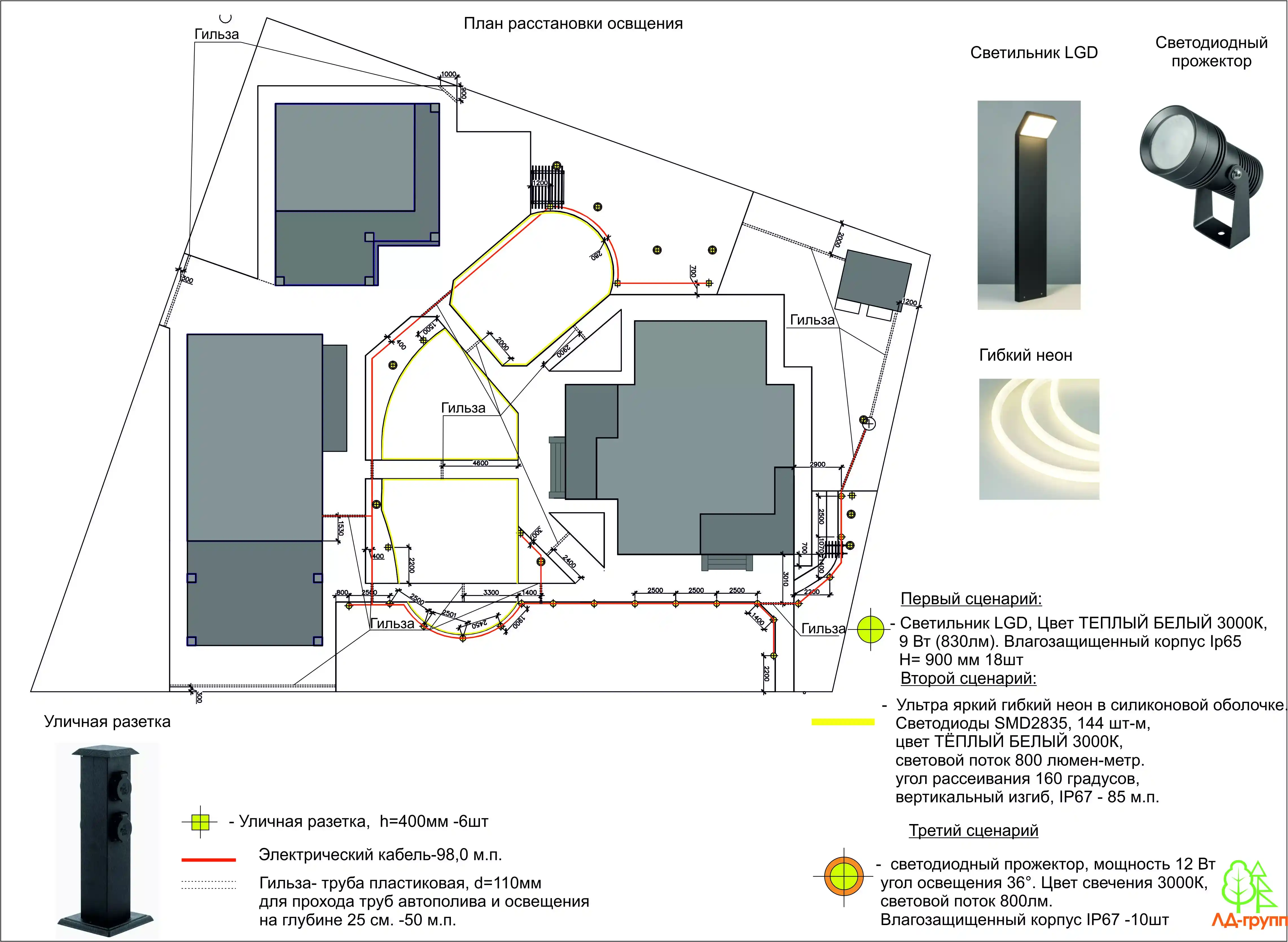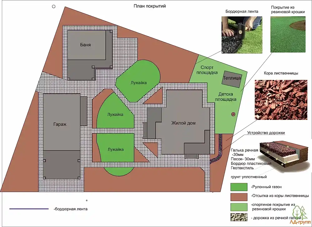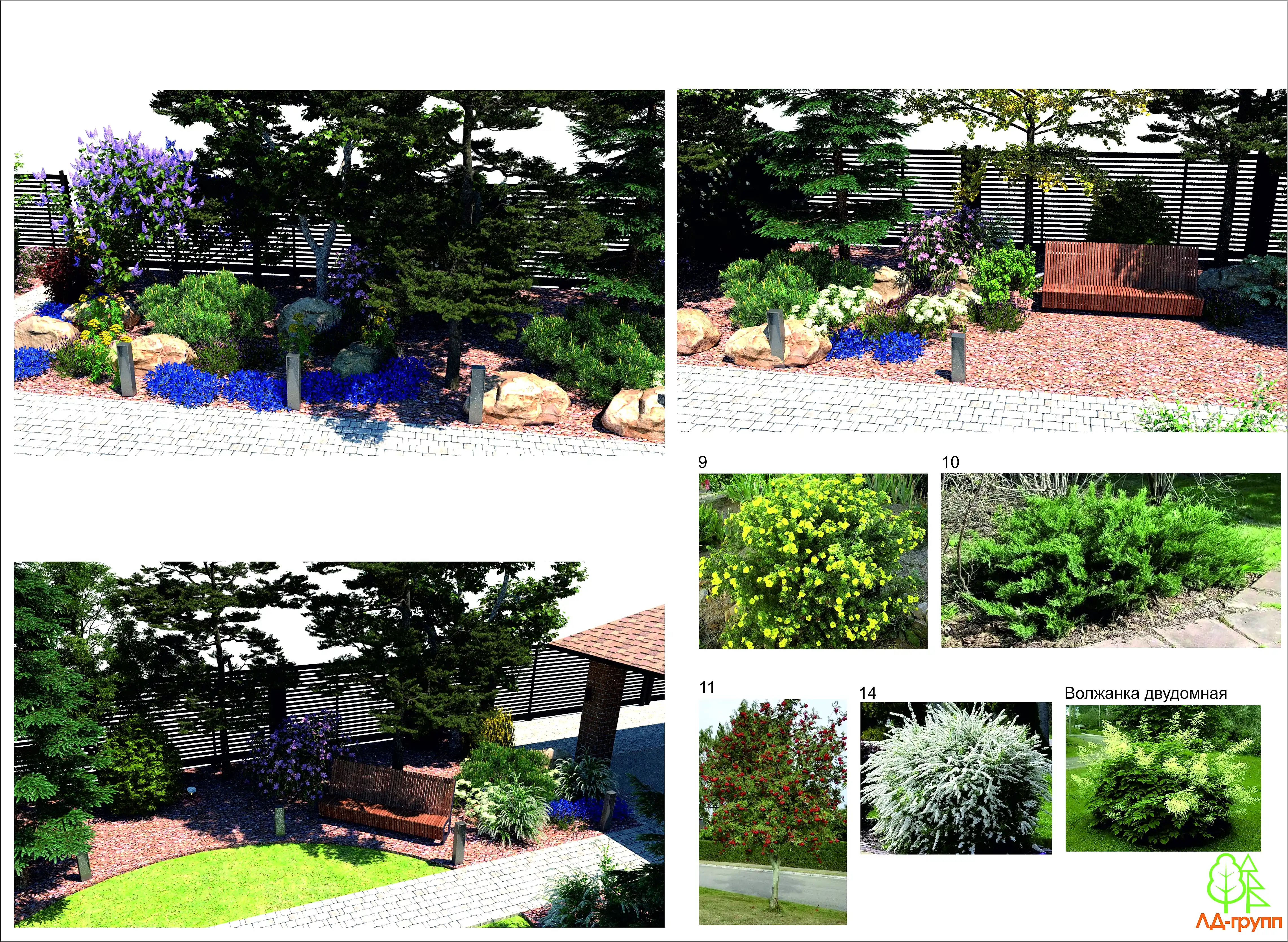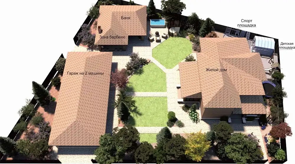 Участок на 15 сотках для молодой семьи из 4х человек. Заказчикам хотелось ощущение уюта, леса с лужайками. Зона отдыха расположилась рядом с баней и барбекю. На ней разместились летний бассейн, место под костровую чашу и подвесная кровать. Эта зона используется под уличный кинотеатр. С торца и сзади дома размещены спортивная площадка и детская. А так же теплица специально для детей, увлеченных ботаникой. Функциональное и декоративное ландшафтное освещение имеет многоуровневую систему из разнообразных осветительных «PinUp»