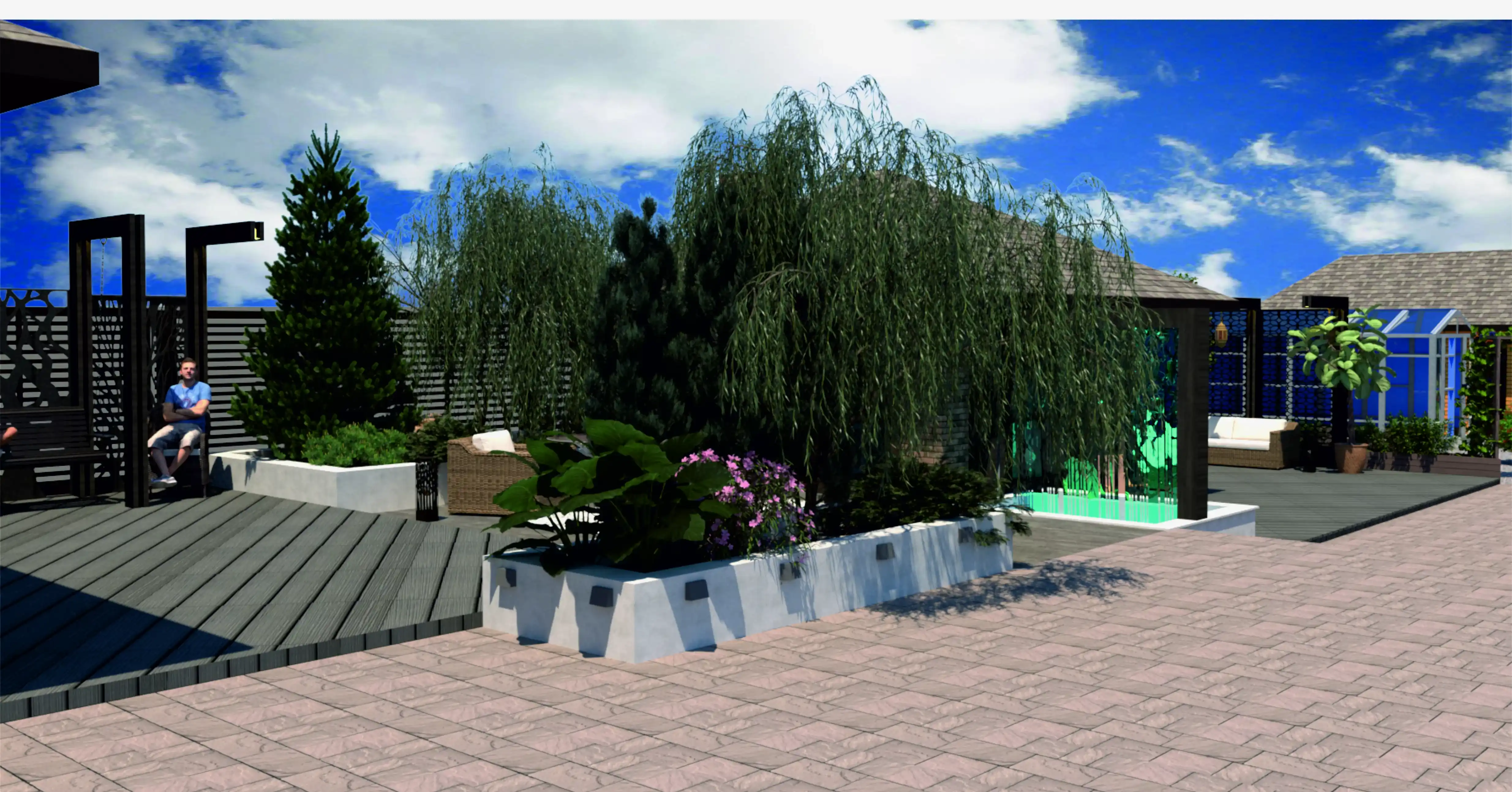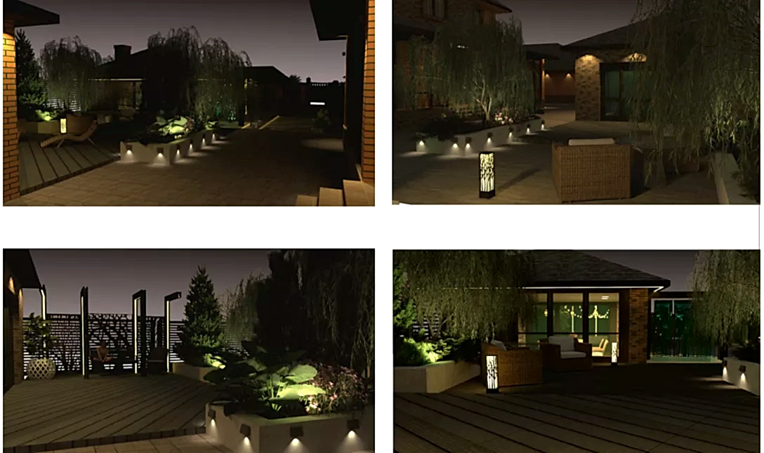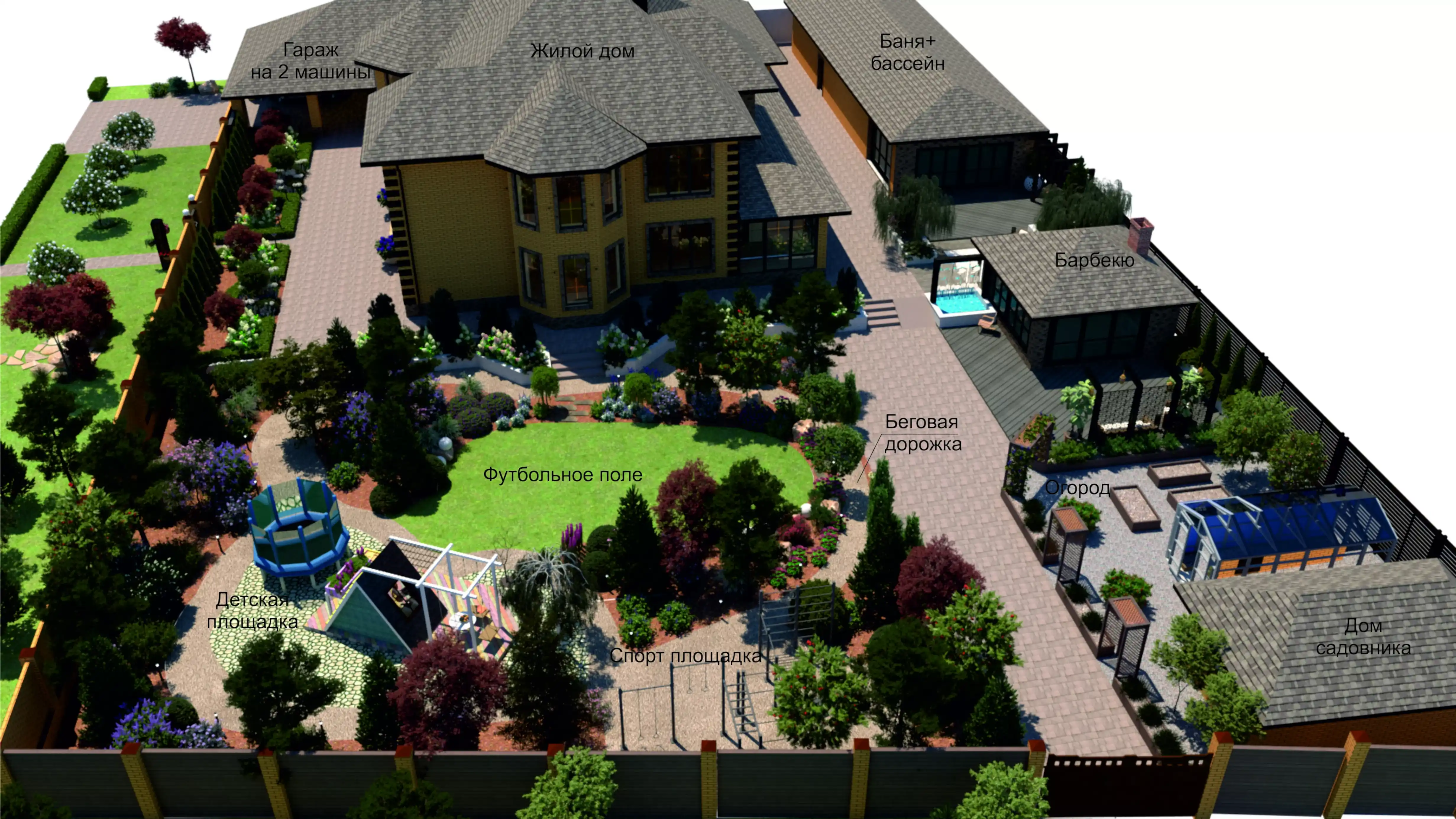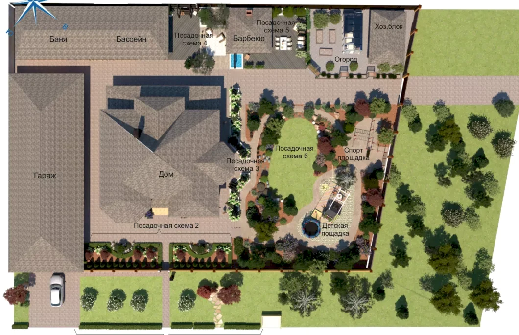 Место объекта: коттеджный поселок в г.Алматы. Участок на 22 сотках для многодетной спортивной семьи. На территории нужно было разместить комплекс с баней, бассейном и хоз помещениями, зону барбекю с возможностью приватного отдыха и отдыха в компании, огород с теплицей и домиком для садовника, спортивной и детской площадками. Перепад высот на участке был использован для решения рельефа в 2х уровнях. Так появились подпорные стенки-клумбы с можжевельниками и гортензиями. На участке появилось мини футбольное поле и беговая дорожка вокруг него. А так же водный объект в виде водопада, отделяющий две зоны отдыха. Ажурная ширма отвлекла внимание зоны отдыха от огорода. Ночное освещение разнообразно и поделено на сценарии. Оно создает атмосферу сказки и праздника.