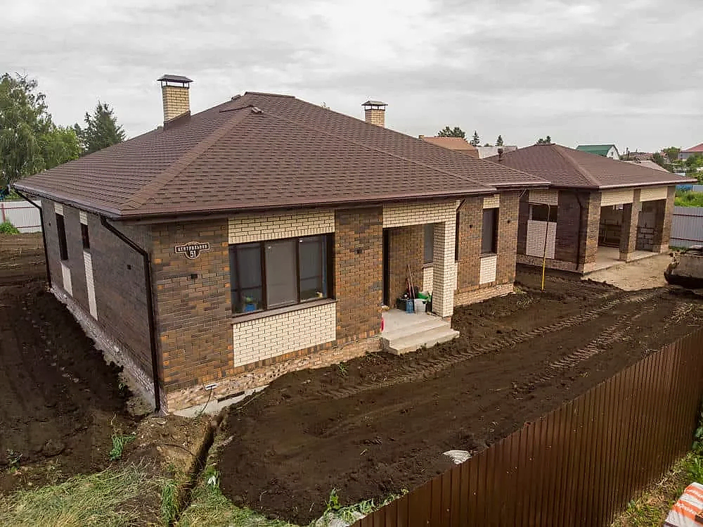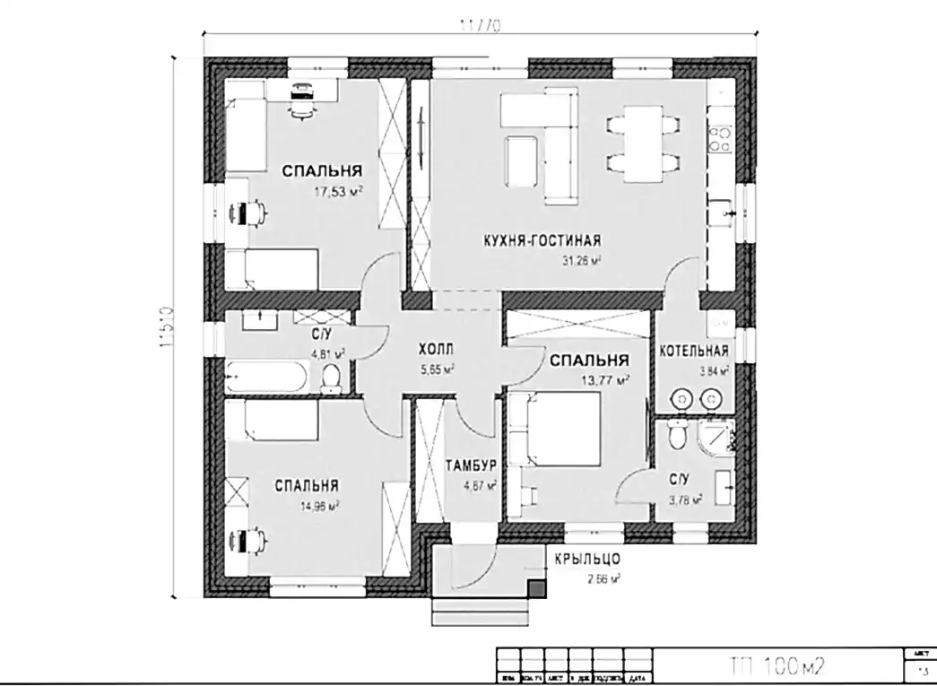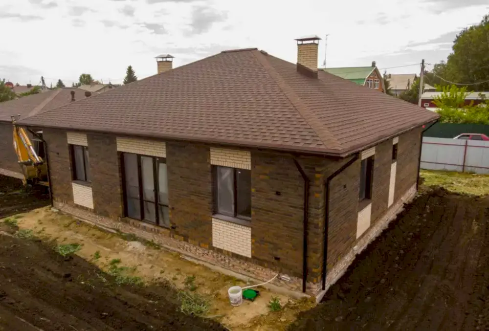 Проект реализован в 2023 году компанией ООО «33 Коттеджа» по типовому проекту в д Приветная. Объект представляет собой: одноэтажный дом площадью в 100 кв. м, построен из автоклавного газобетона толщиной в 200 мм, на железобетоном фундаменте, облицован керамическим кирпичо