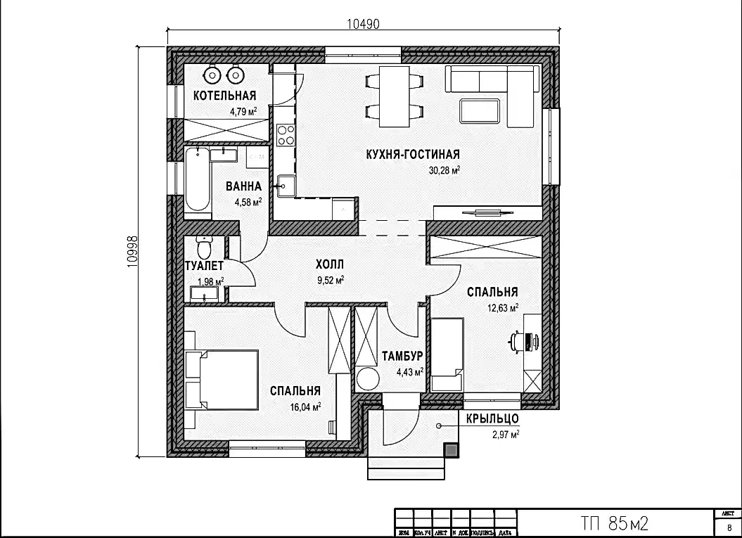 Проект реализован в 2023 году компанией ООО «33 Коттеджа» по типовому проекту в КП Ракитинка. Объект представляет собой: одноэтажный дом площадью в 85 кв. м, построен из автоклавного газобетона толщиной в 200 мм, на железобетоном фундаменте, облицован керамическим кирпичо