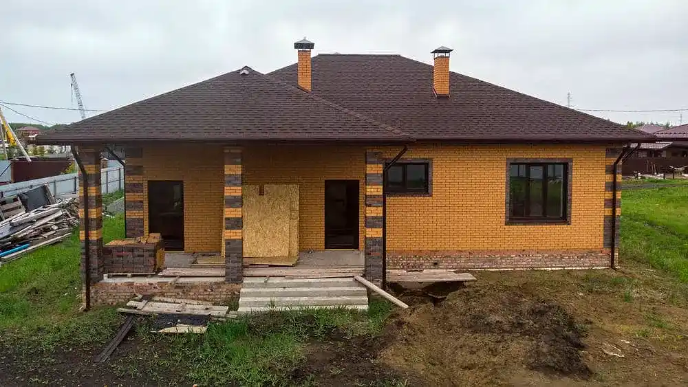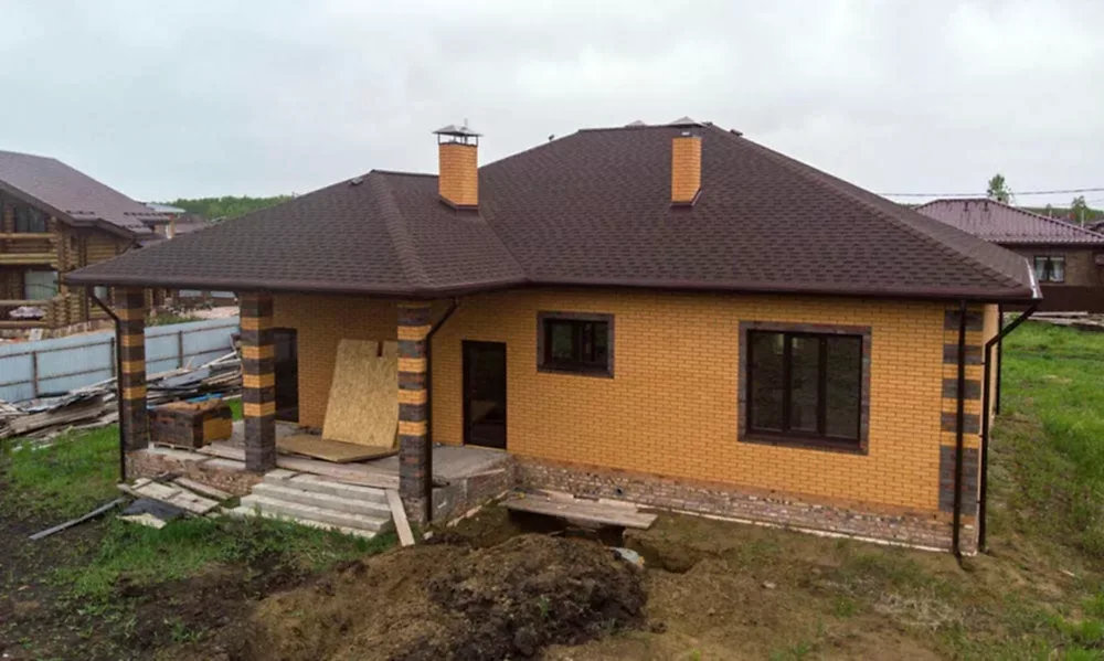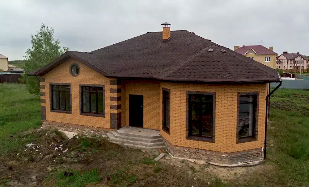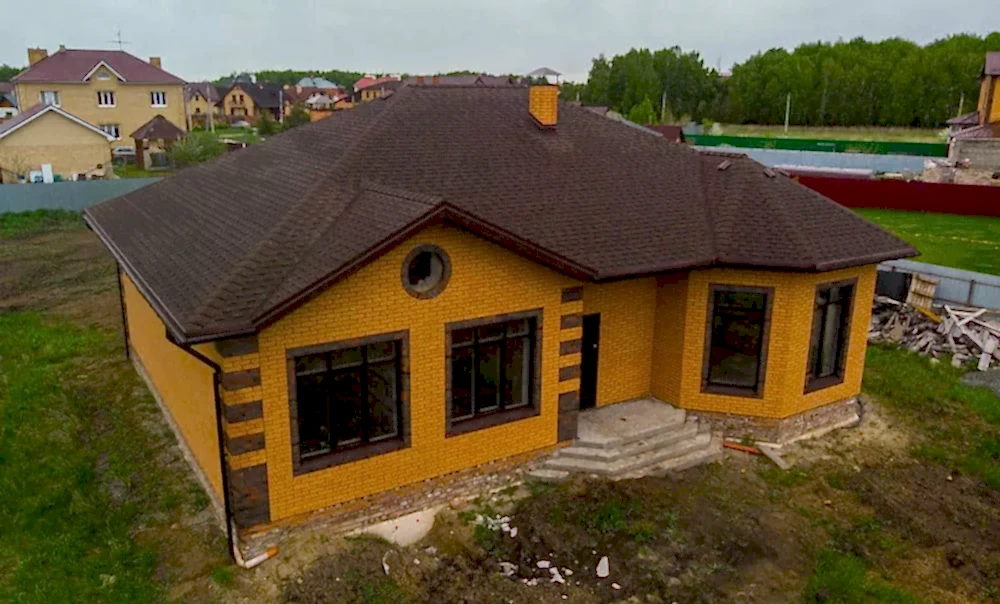 Проект реализован в 2023 году компанией ООО «33 Коттеджа» по типовому проекту в п. Чукреевка. Объект представляет собой: одноэтажный дом площадью в 164 кв. м, построен из автоклавного газобетона толщиной в 300 мм, с утеплением на железобетоном фундаменте по буронабивным сваям, облицован керамическим кирпичо